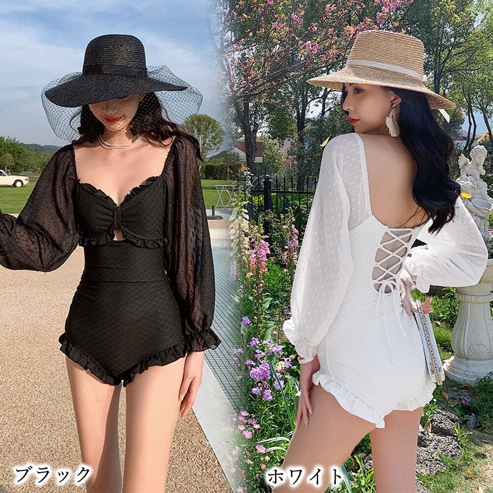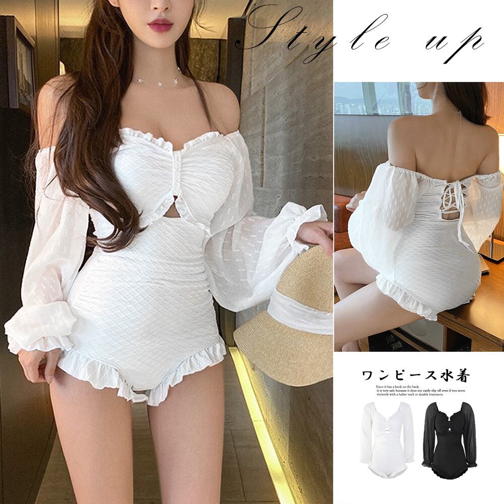 セクシー 水着 チュール袖 胸元リボン フリル プール水着 オフショルダー バックレースアップ リゾート サマー海
