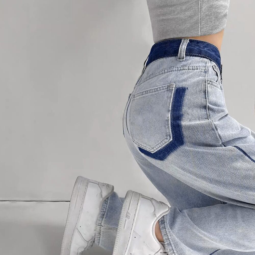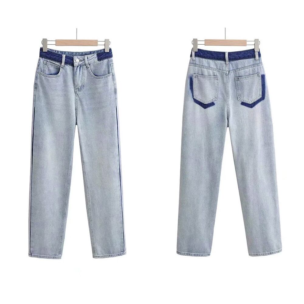 配色ストレートデニムパンツ ハイウエスト