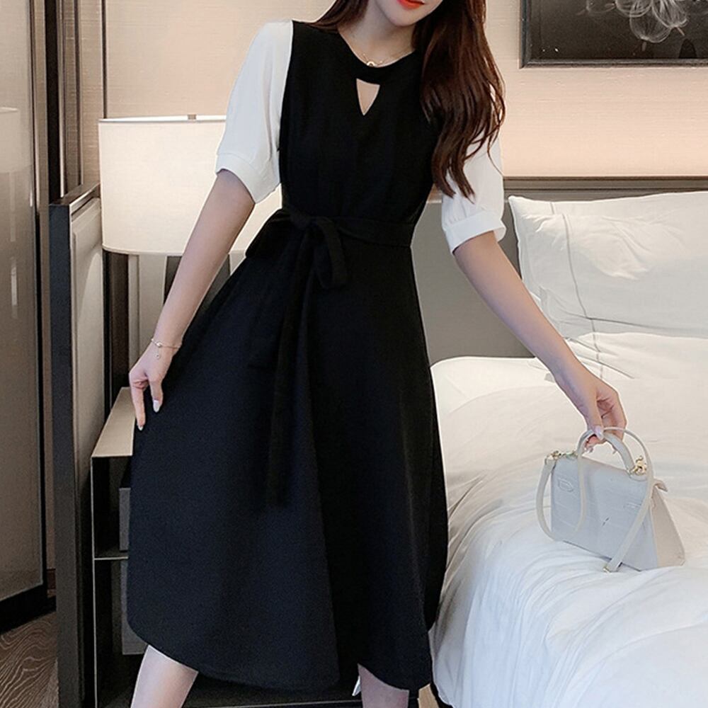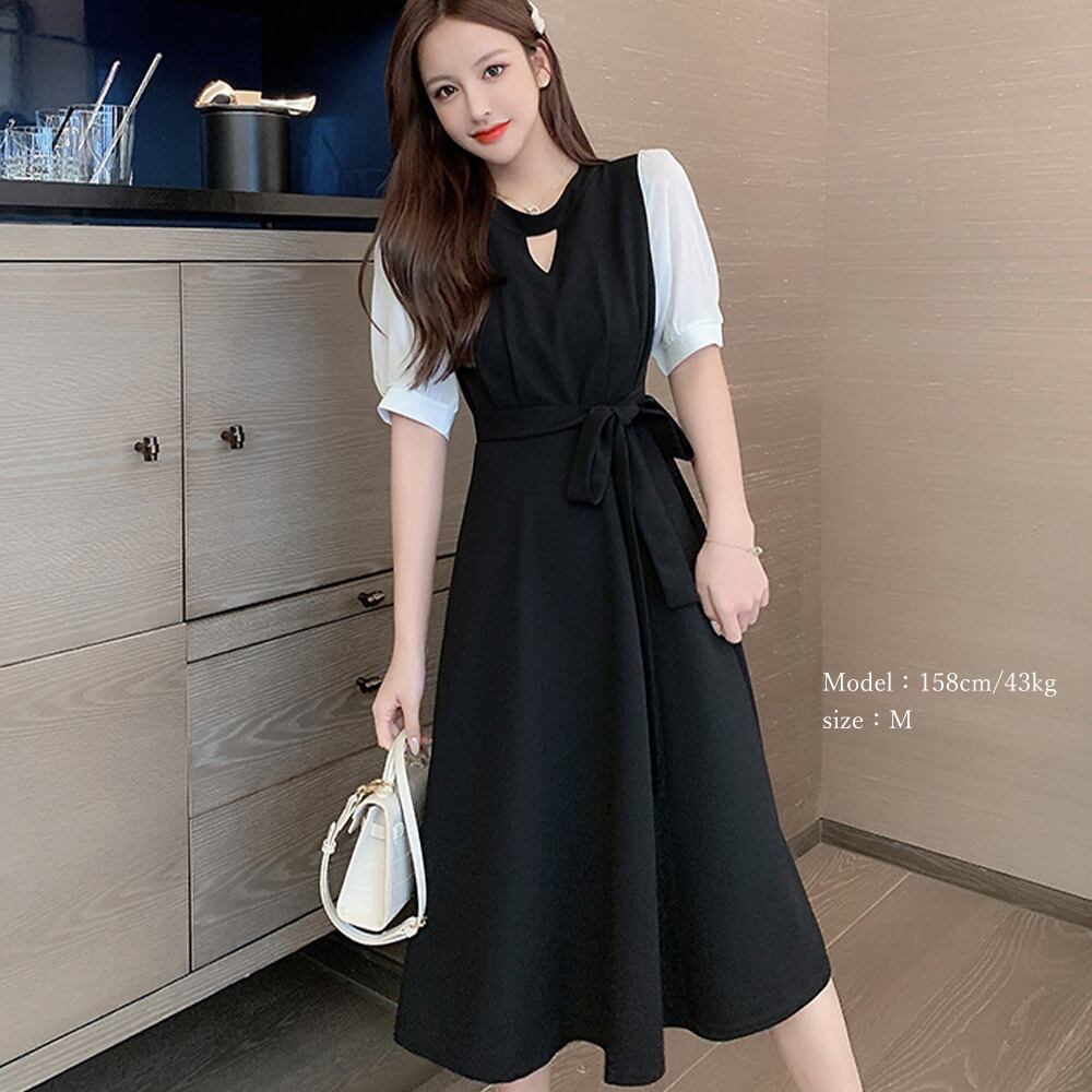 レディース 半袖 シフォンスリーブワンピース ウエストマーク ロングワンピース 体型カバー フレアワンピ