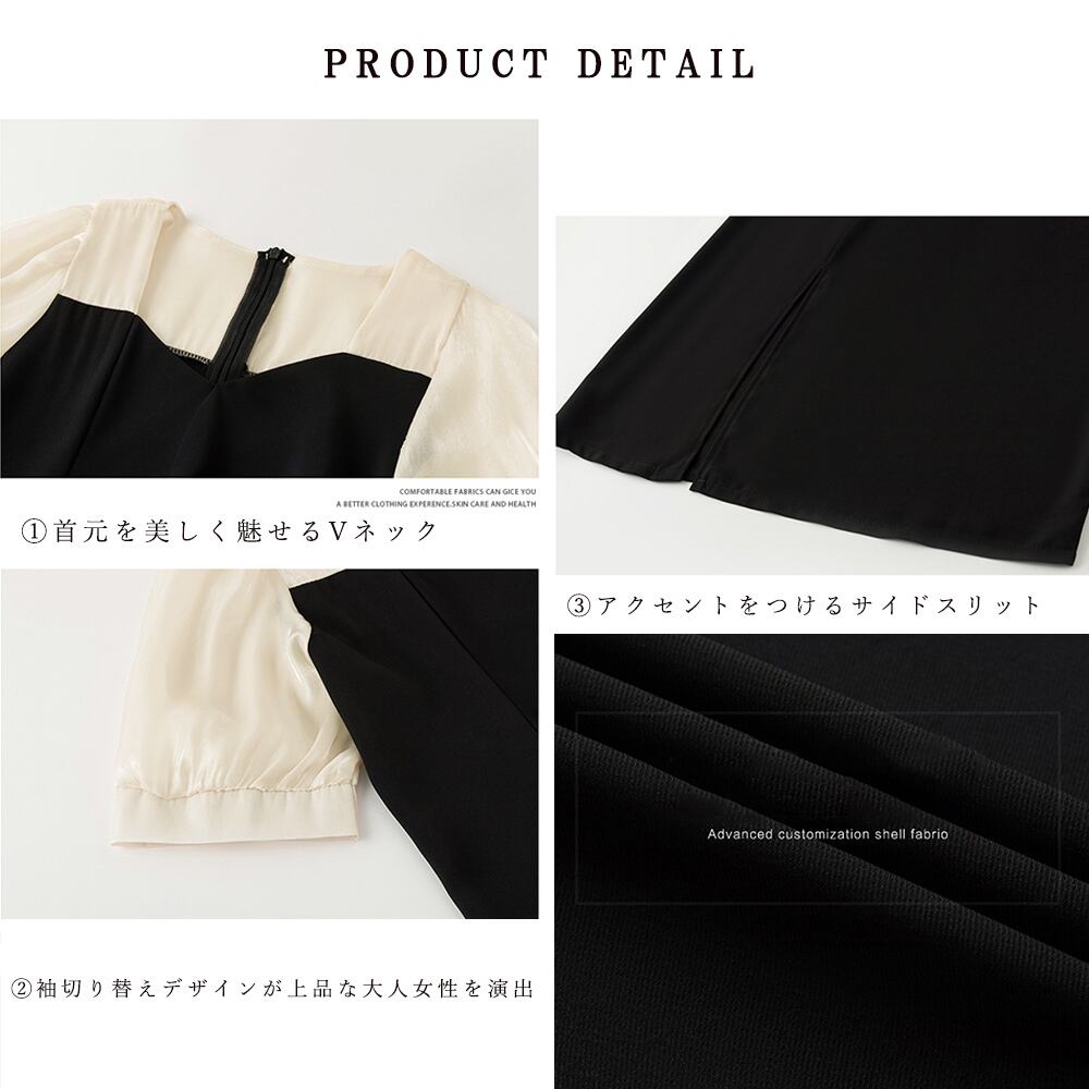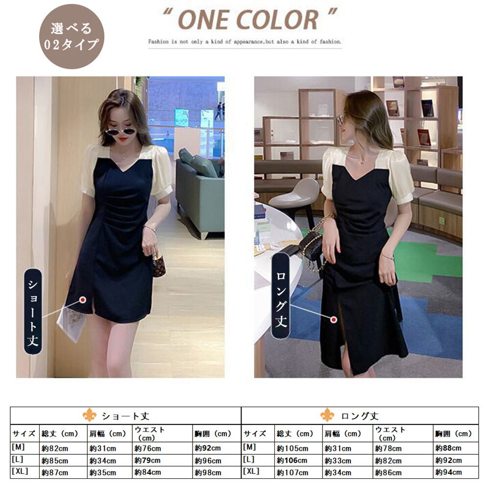 Vネックワンピース レディース 上品清楚 パフスリーブ ミニワンピ 異素材 きれいめ 光沢感 大人かわいい ドレス 夏服