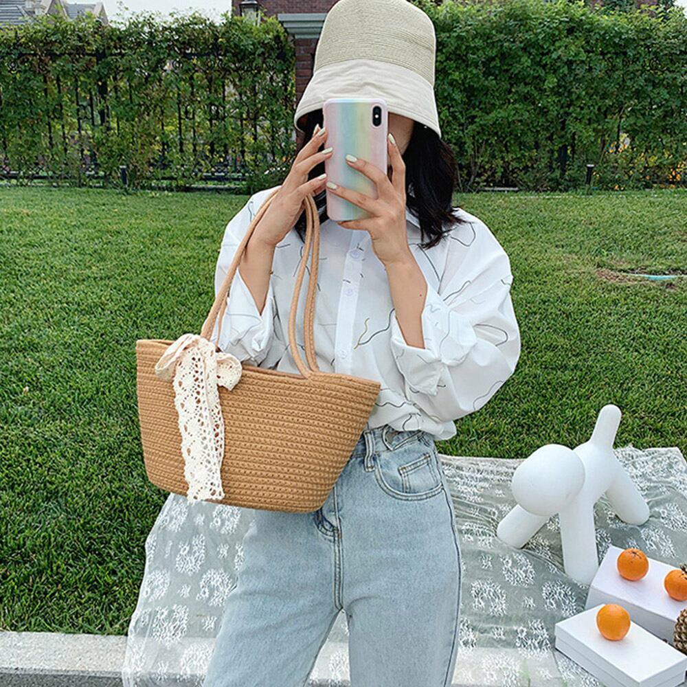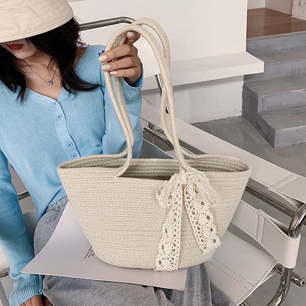 シーズンムード漂う素材でワントーンに統一した自然体なレースリボン付きかごバッグ