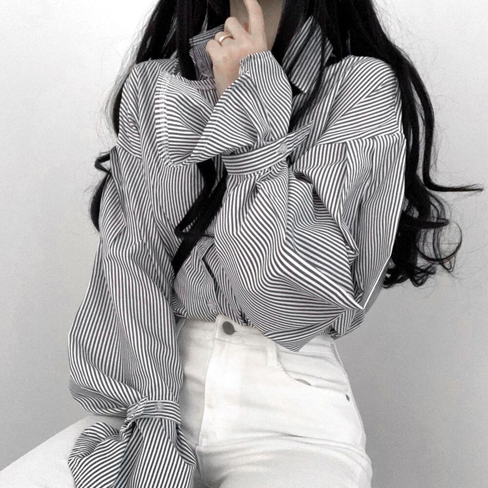 ボリューミーなキャンデースリーブが女性らしい華奢な印象に見せてくれるストライプ柄シャツ