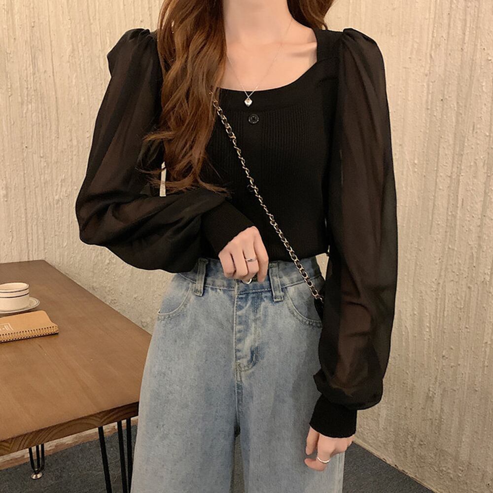 ニットトップス レディース フェミニン感ブラウス 無地 ボリューム袖 トップス シンプル 袖透け感
