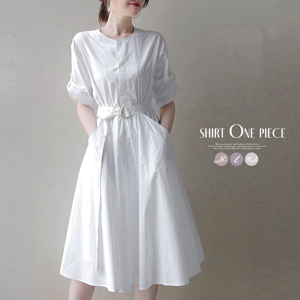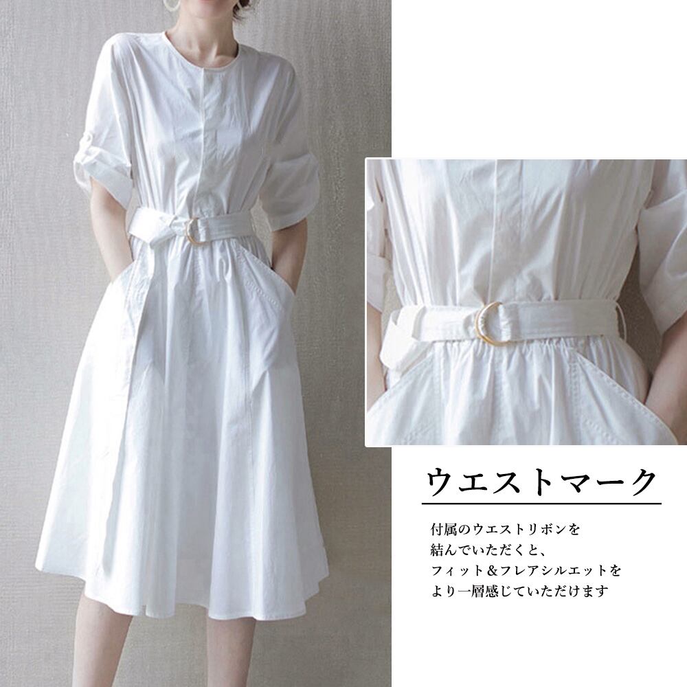 レディース Aライン 膝丈ワンピース白 ウエストマーク ポケット付き 夏ワンピース 上品 シンプル 無地ワンピ 通学通勤