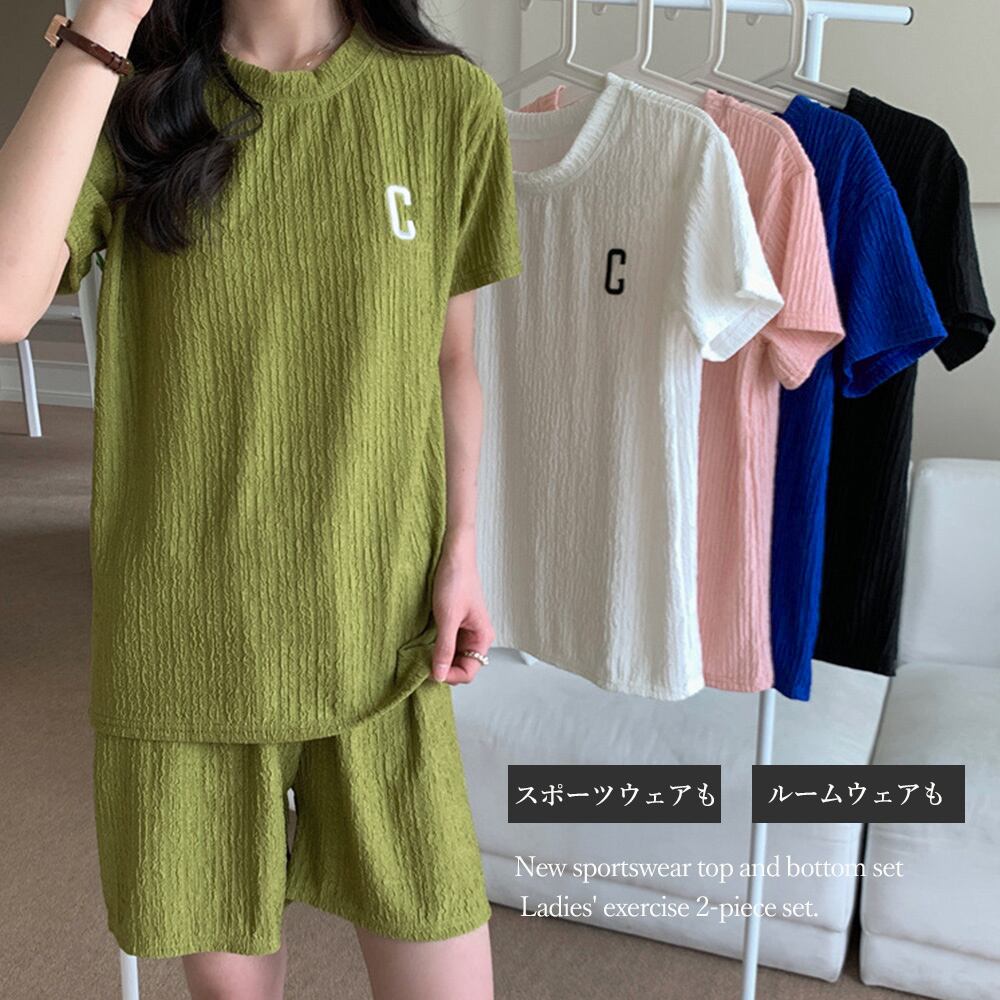 凹凸のある素材感がかわいい、半袖カジュアルスポーツウェア上下セット。