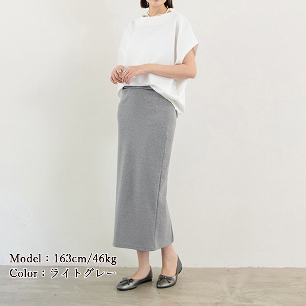身体のラインを拾いすぎないセミタイトが女性らしい着こなしを演出するリブニットスカート