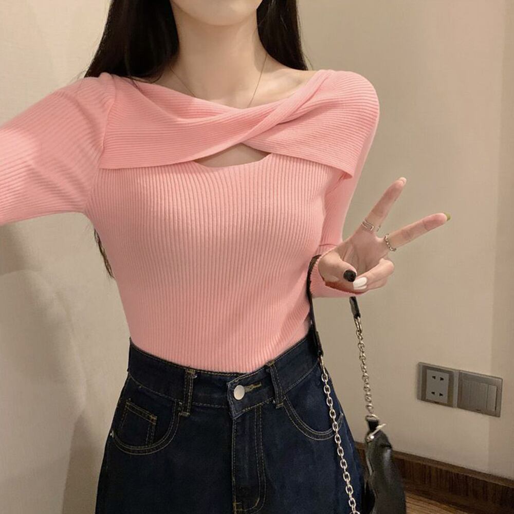 フロントのツイストデザインがレディなアクセントのリブニットトップス