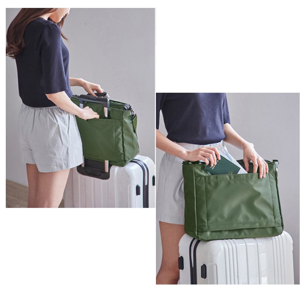 背中のポケットをキャリーの持ち手に被せて、バッグがキャリーの上でずれる心配もなく安心