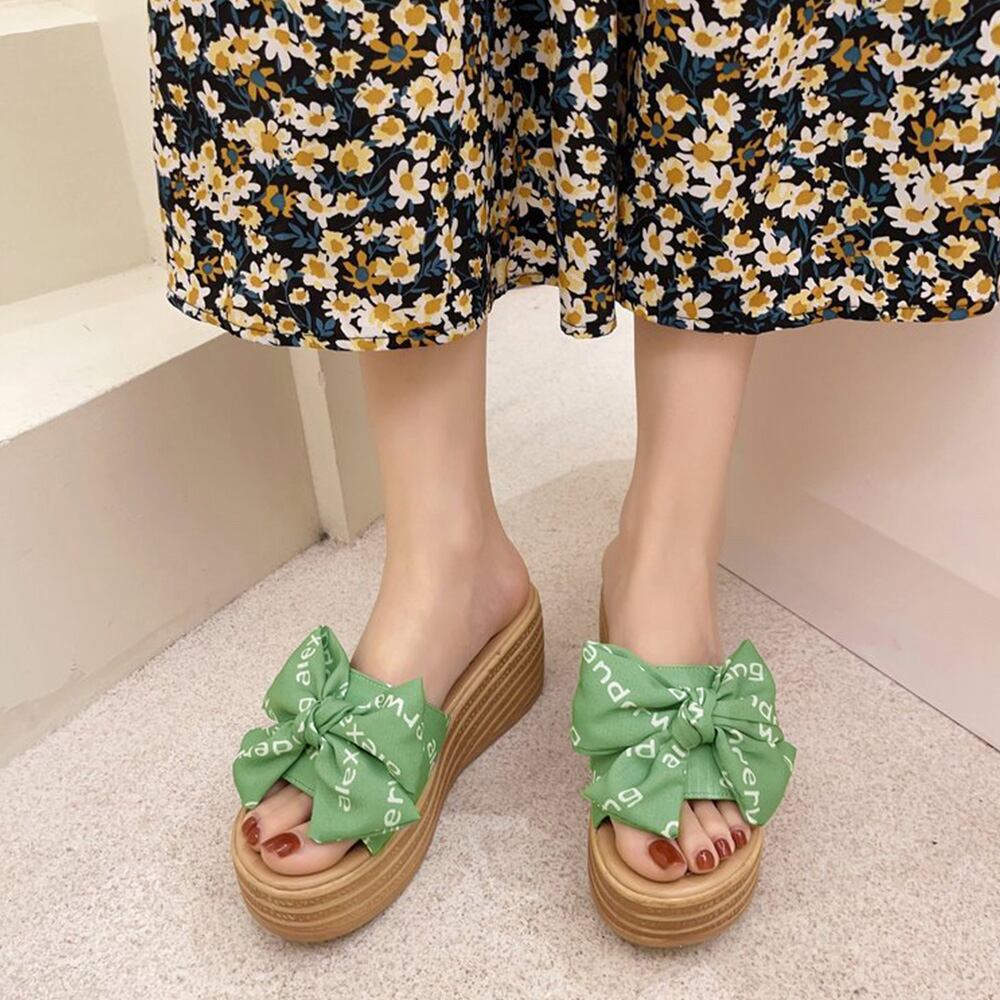 大きい蝶結び付きの太め一字型甲ベルトは足元をより華奢に引き立つ
