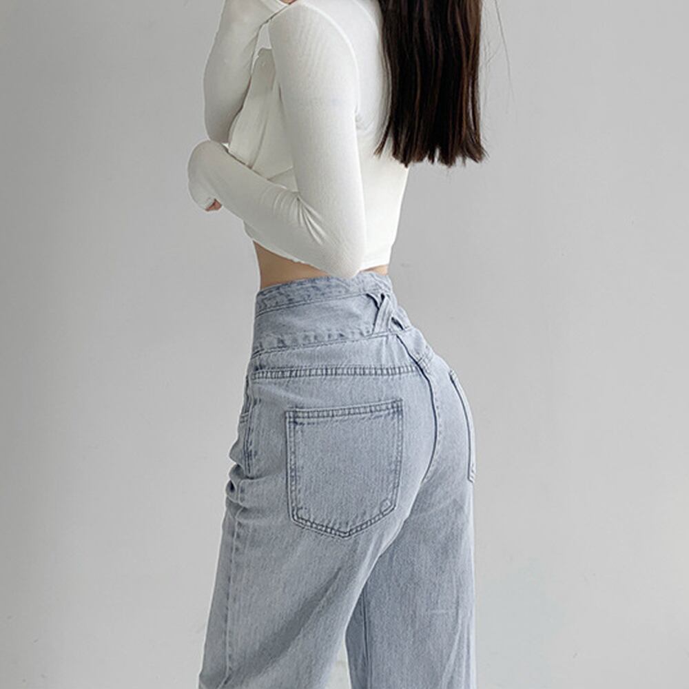 ウエストボタンは3つ付き、美脚シルエットにこだわった大人のハイウエストデニムパンツ。