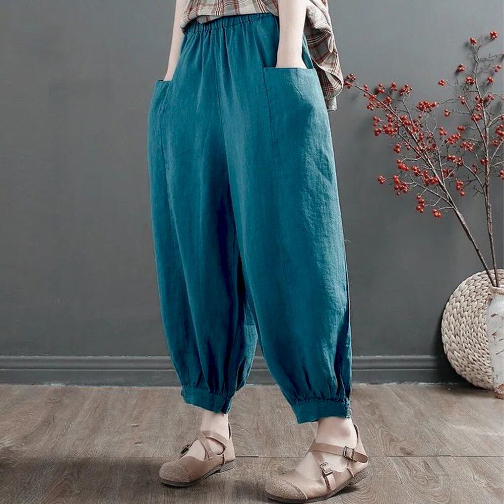 リネンパンツ ウエストゴム 着やせ パンツ ゆったり ポケット付き 九分丈パンツ カジュアル クロップドパンツ