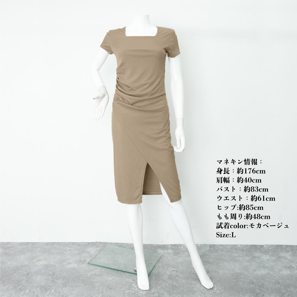 レディース 韓国 スリット スクエアネック スリムフィット ギャザー 夏 薄手ワンピース セクシー大人 細見えワンピ