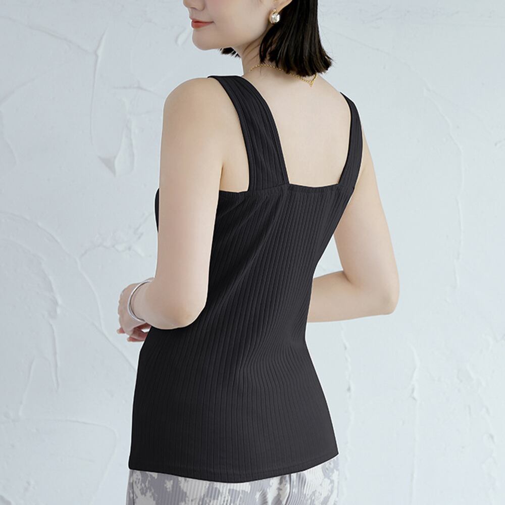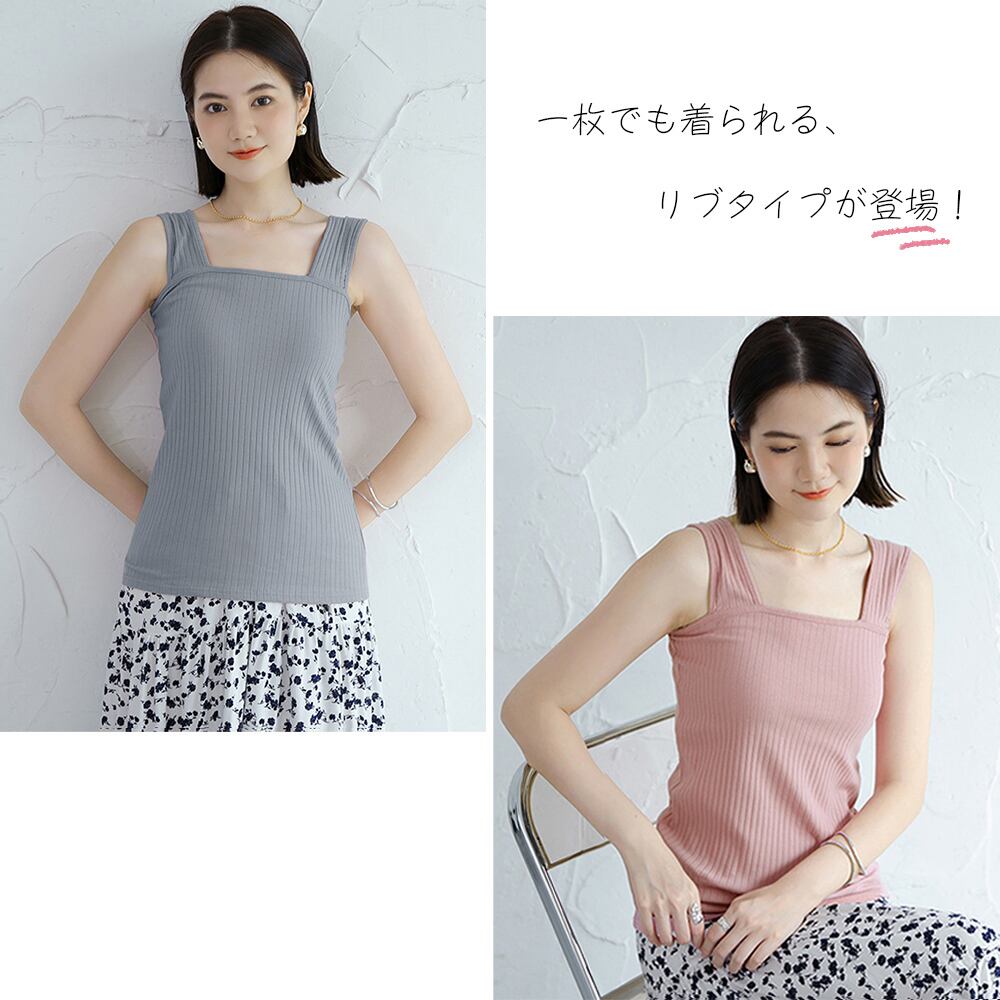 肩紐部分が下着の紐をすっぽり覆えるように太く作られたリブタンクトップ