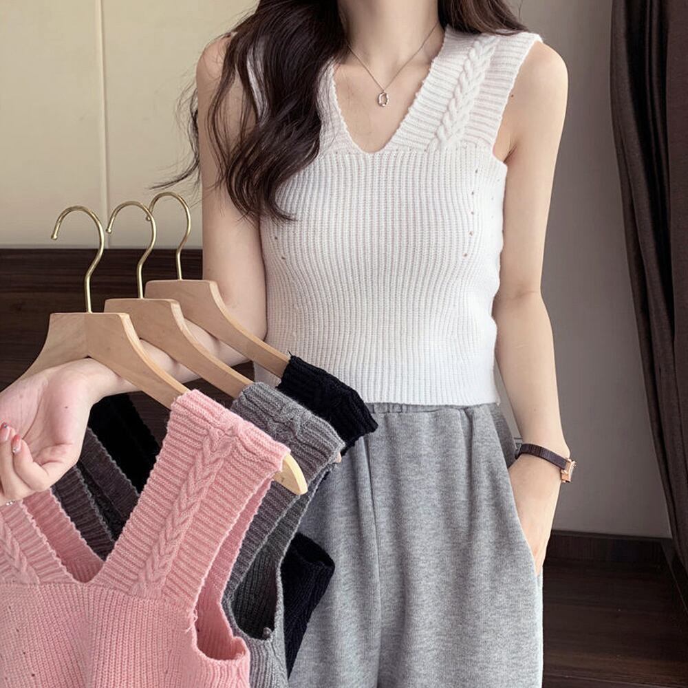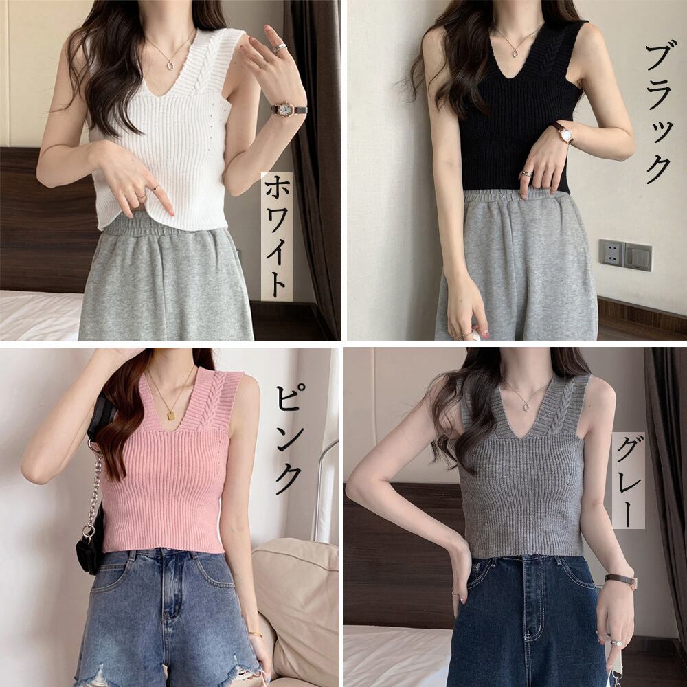 レディース ノースリーブ ショート丈トップス Vネック 重ね着 リブニット 韓国ファッション ニットベスト 通勤通学