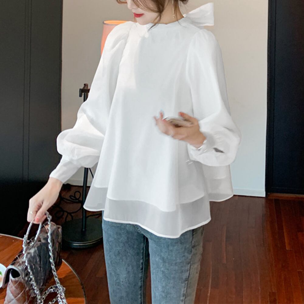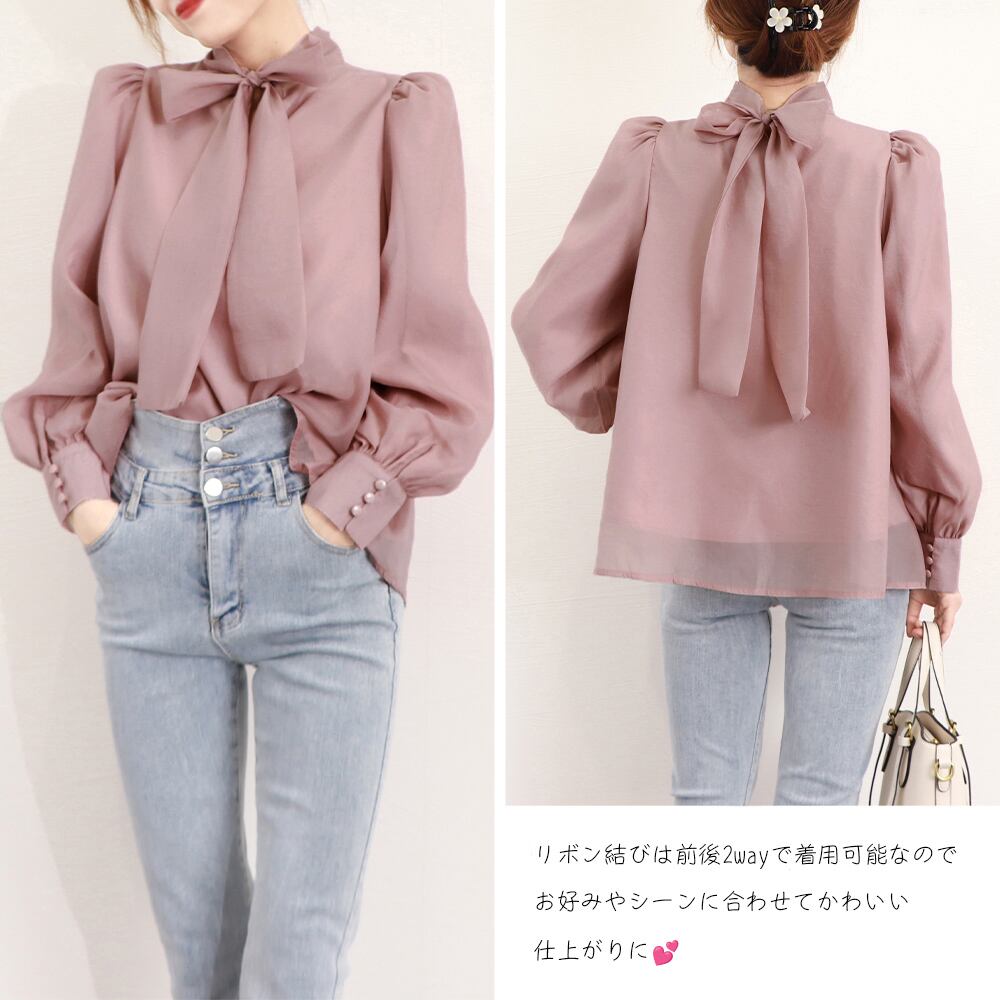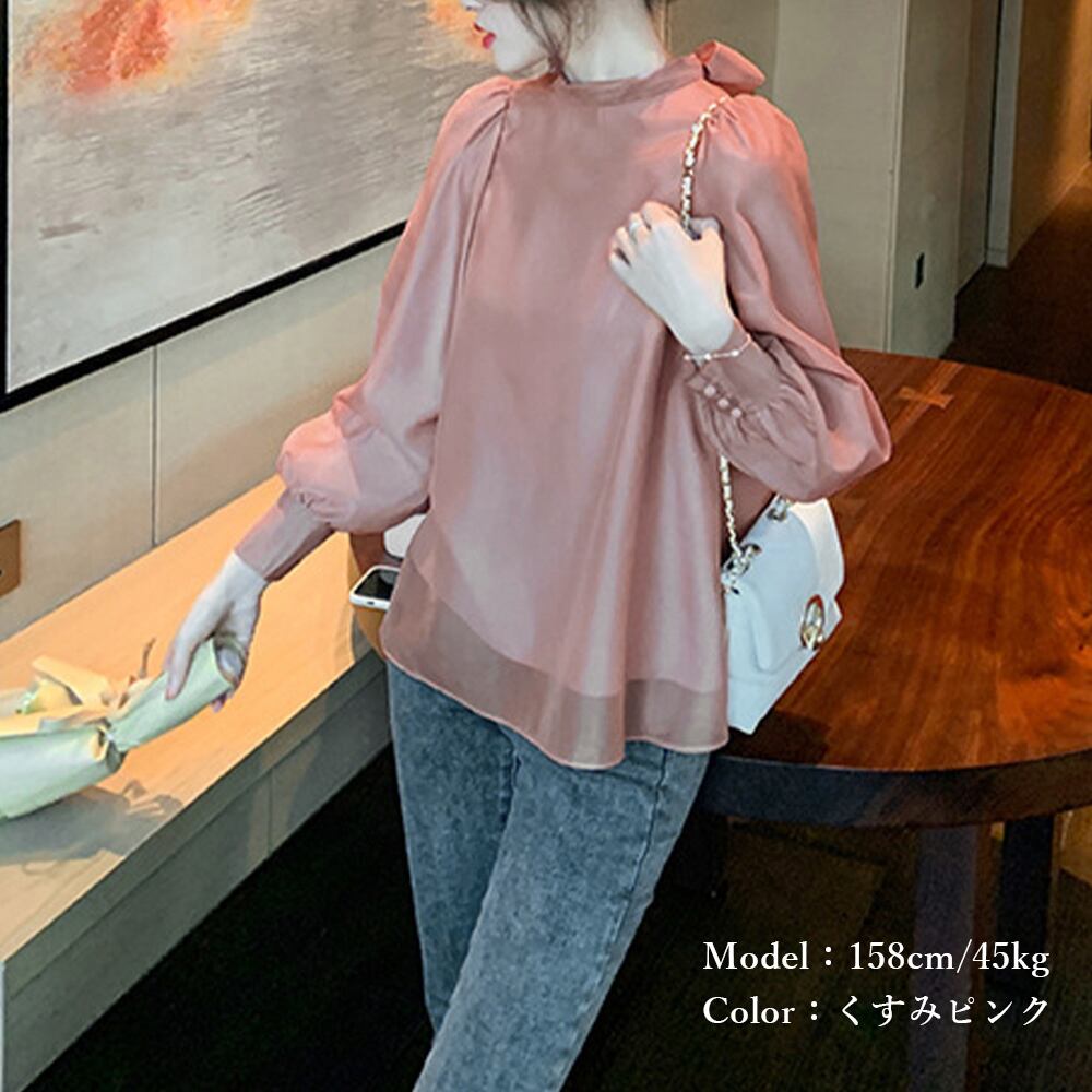 大きめのバックリボンがコーデのアクセントになる、着るだけで旬コーデが決まるオーガンジーブラウス