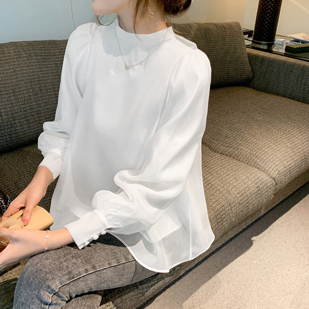 ふんわり パフスリーブ フェミニンブラウス ゆったりオーガンジーブラウス きれいめ女子会長袖ブラウス 前後2way春秋夏