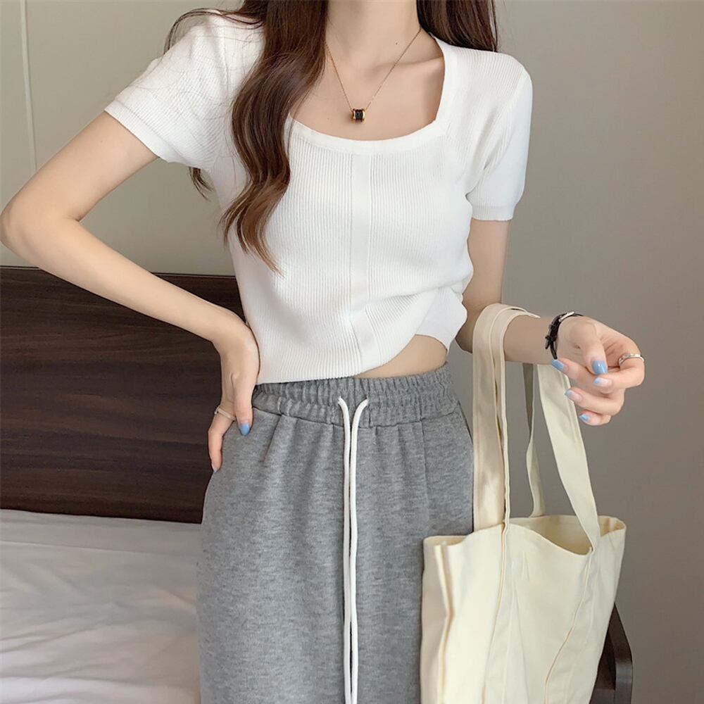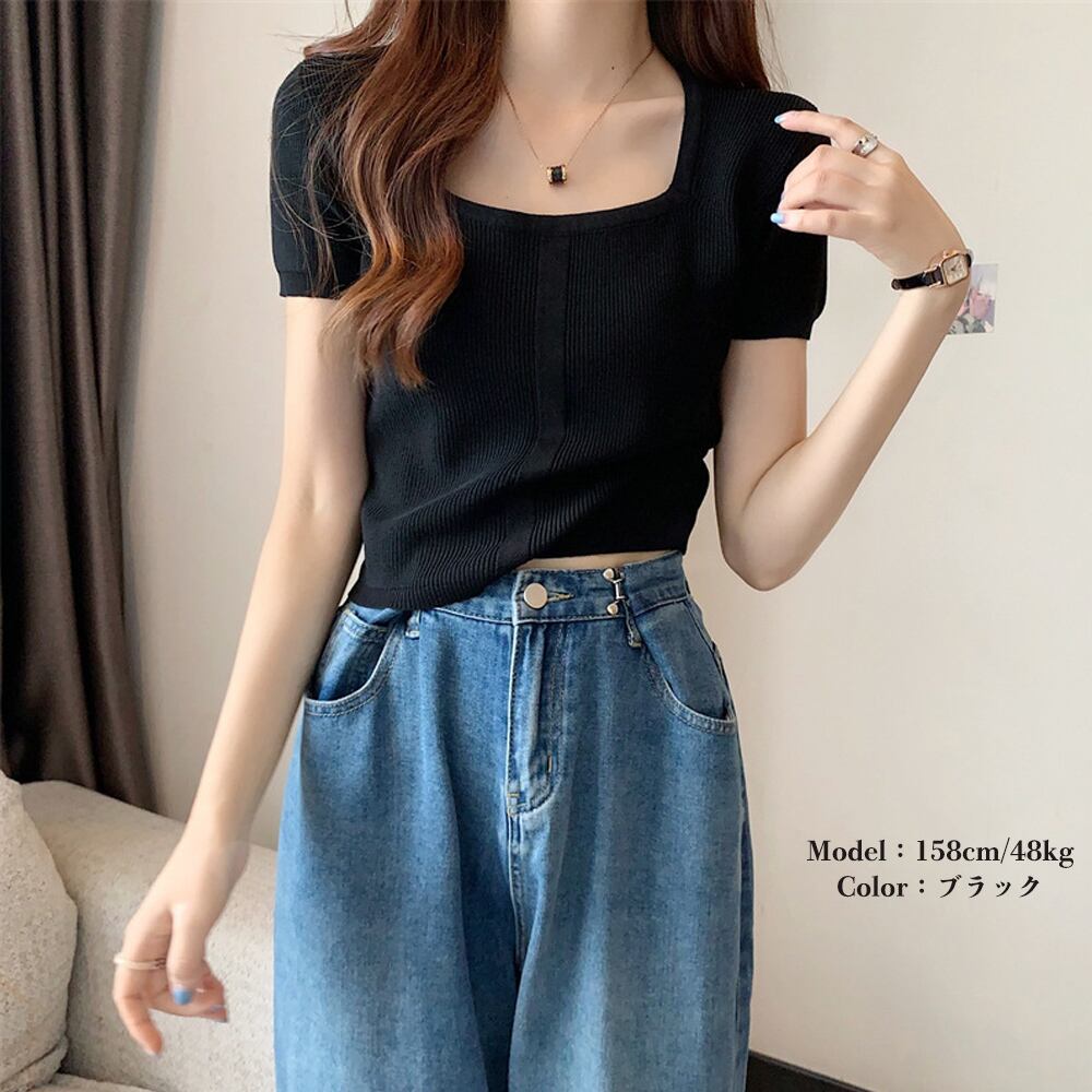 レディーストップス スクエアネック ニットカットソー 半袖 着やせ プルオーバー 薄手シンプル 上品カジュアル 通勤通学