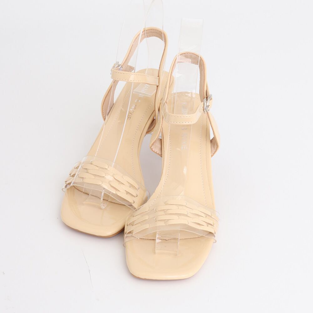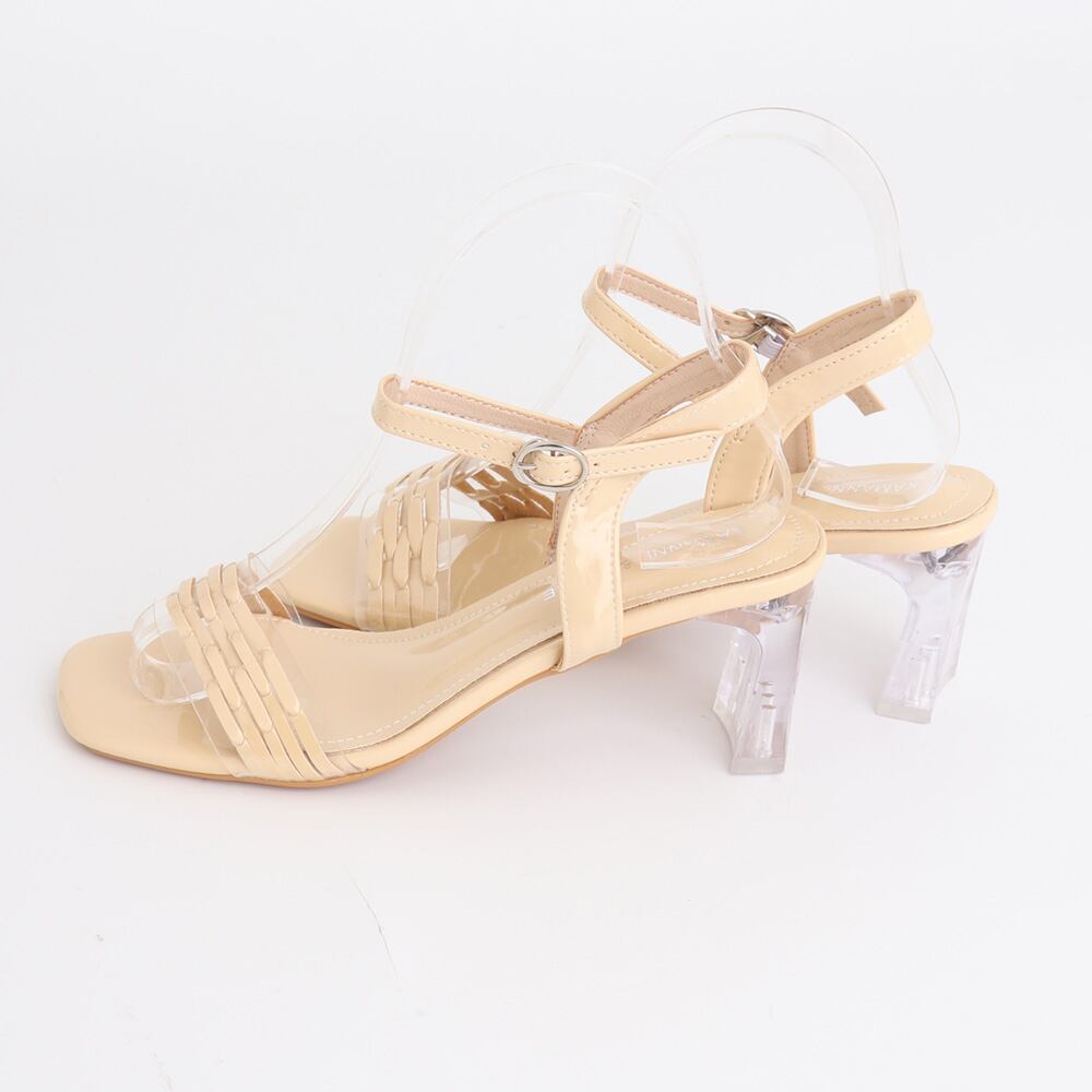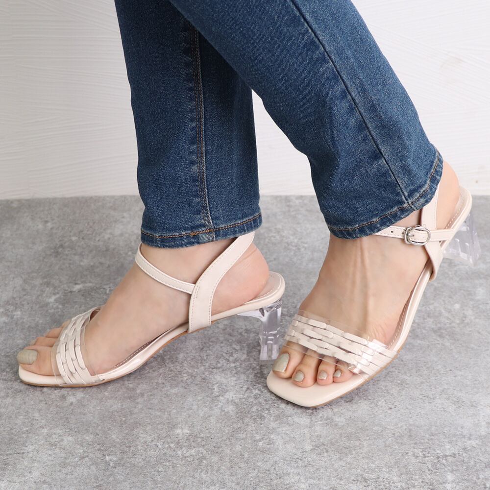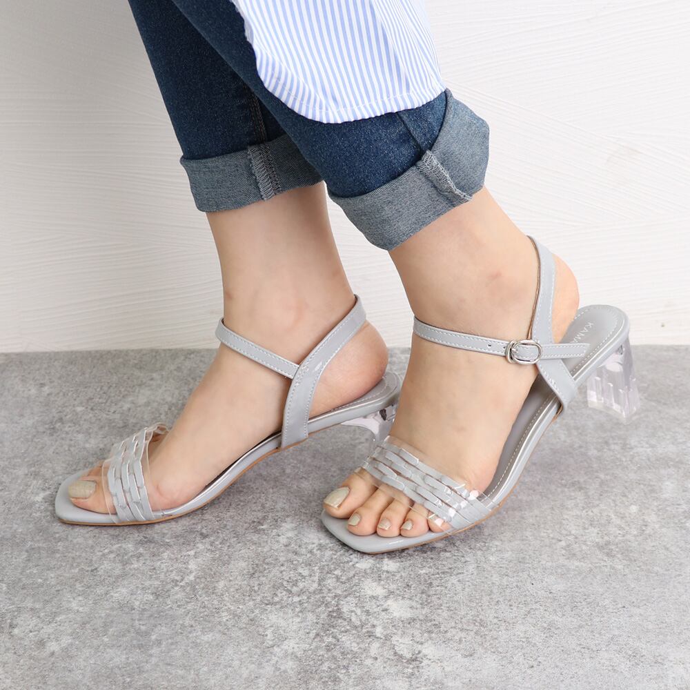 シーズンムード高まるクリアヒールがポイントのスクエアトゥサンダル。