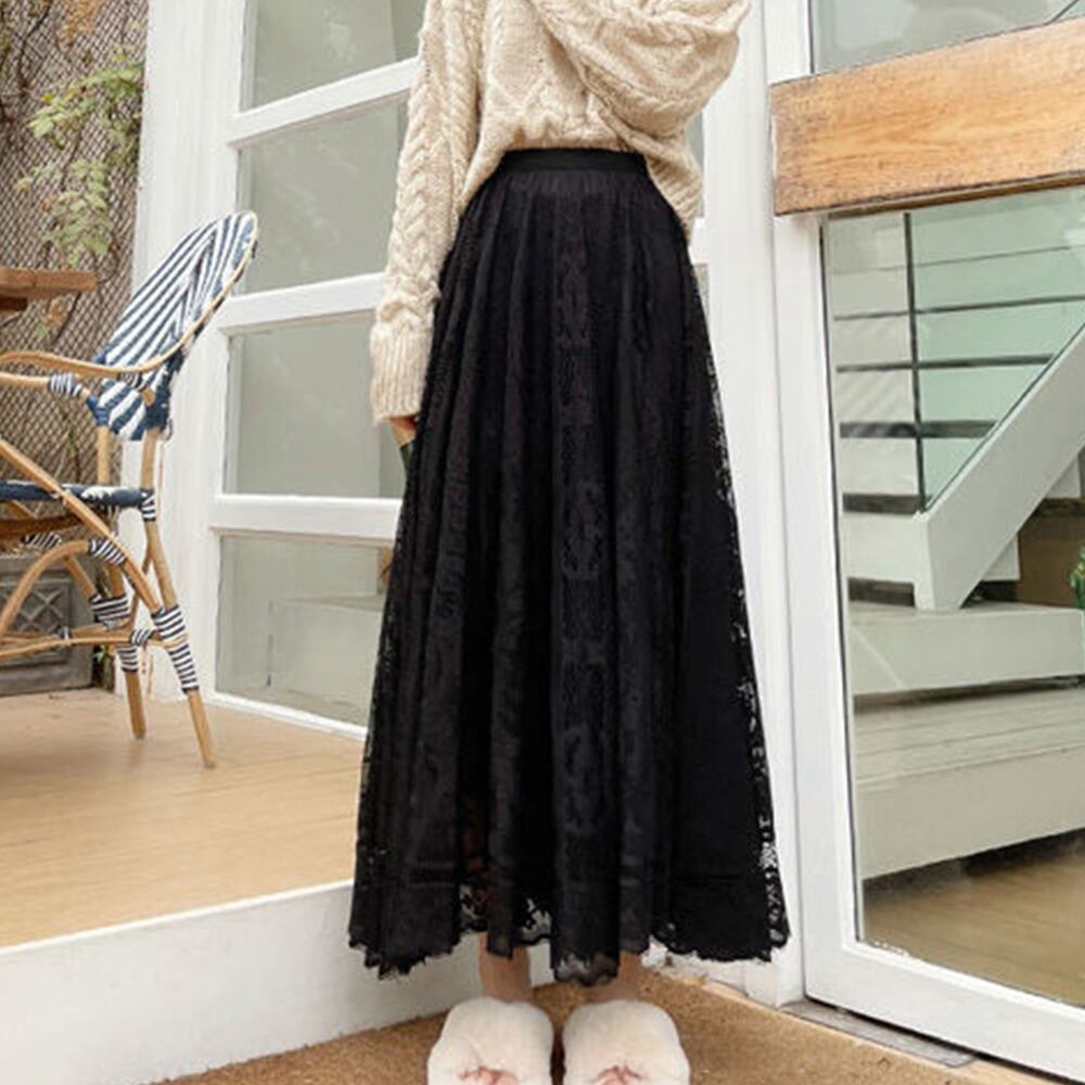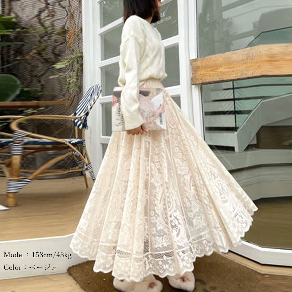 フレアスカート ウエストゴム シースルースカート 裏地付き エレガント ミモレスカート 韓国 フラワーレース お洒落
