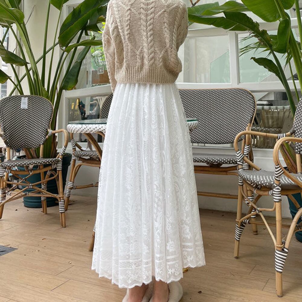 たっぷりとしたボリューム感とフラワーレースが特別感を演出するロングスカート