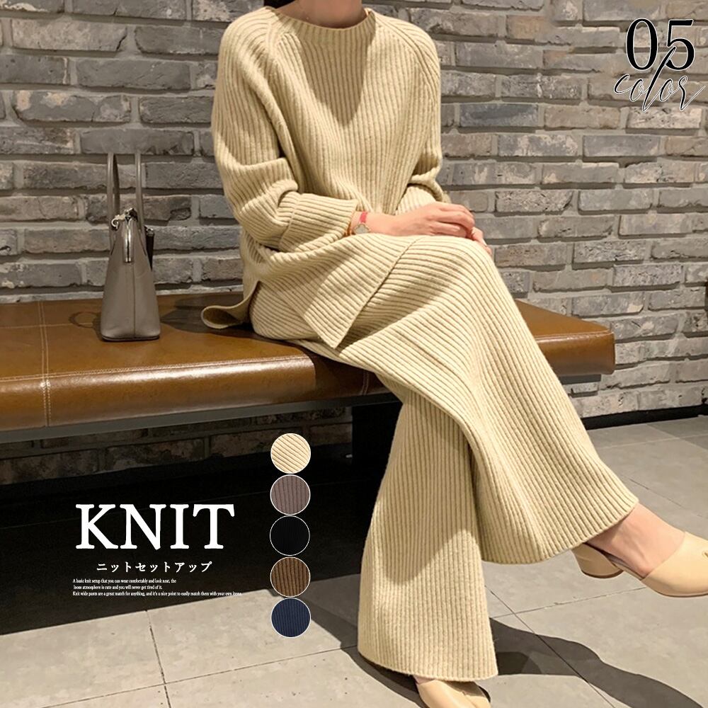 ニットアンサンブル スリット リブニットトップス 長袖 カジュアル ニットセミワイドパンツ 上下セット 30代40代